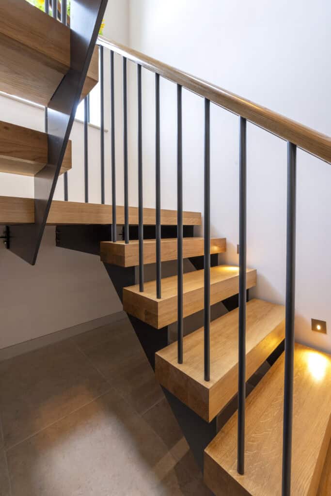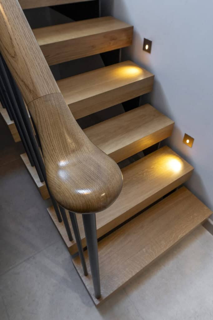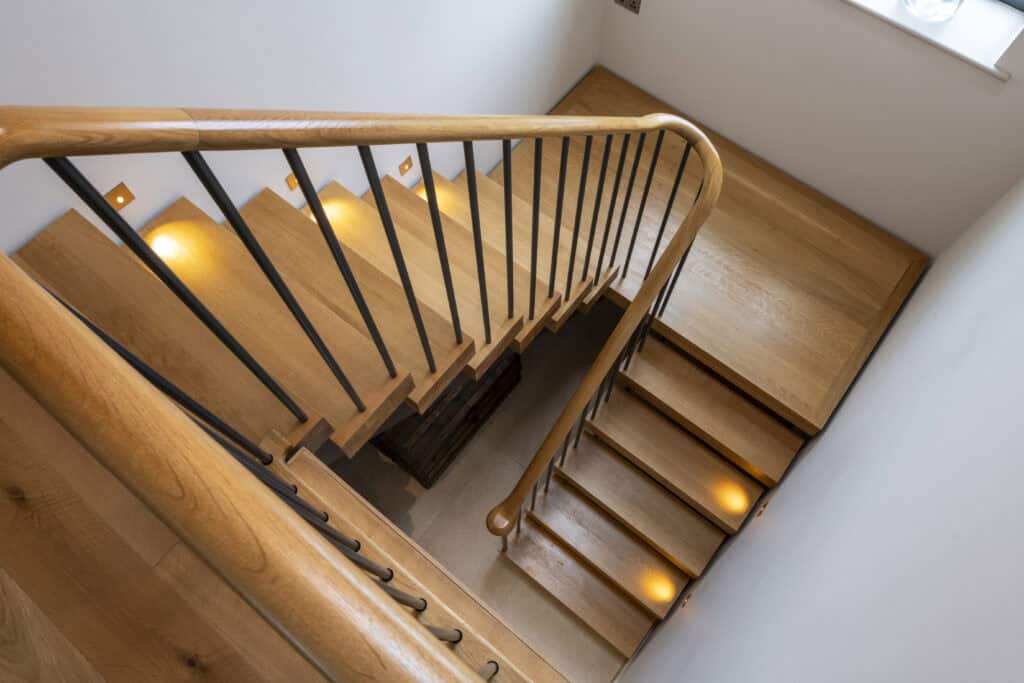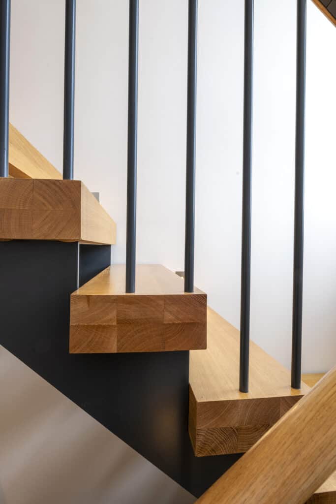 The homeowner explained, “We didn’t feel drawn to the steel staircases with a chunky spine underneath; instead, we wanted wider treads that looked very solid, with a shadow gap around the edge. We chose a handrail that curves elegantly, with no harsh angles.” To keep the design seamless, we also supplied oak caps to cover bolts and where the steel spindles met the landing floor.