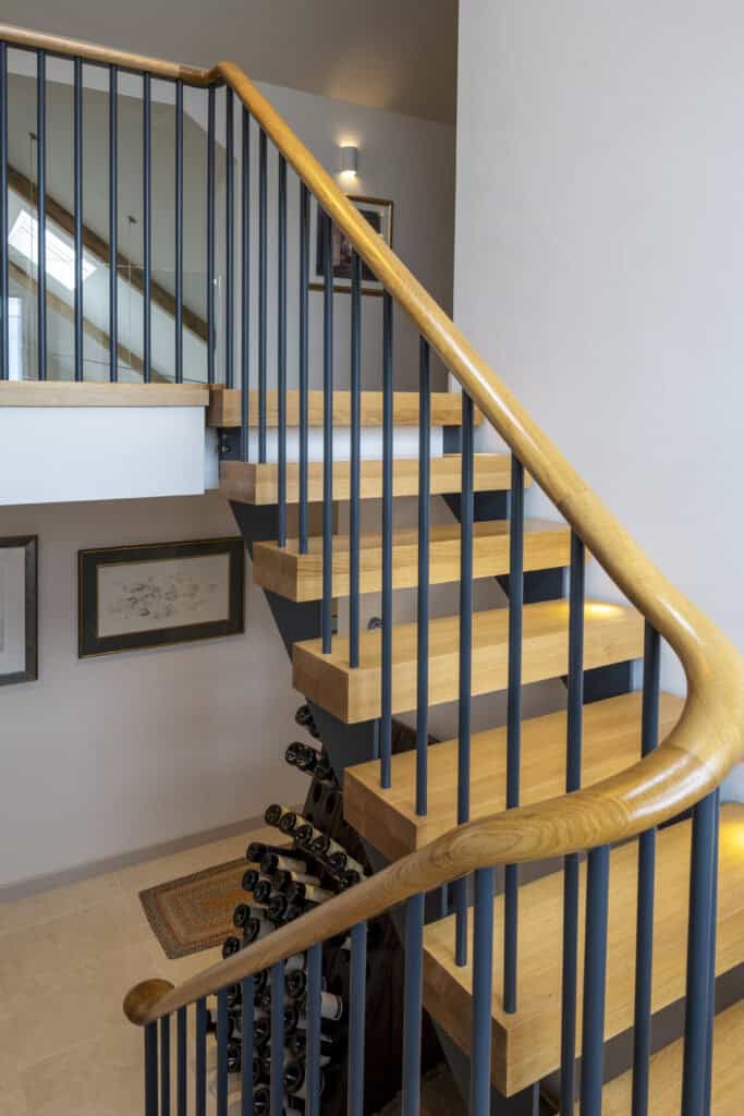 Wanting a design that effortlessly combined contemporary and classic aesthetics, the homeowners opted for a timber handrail, produced by a local joiner, to be added to the steel balustrade of the staircase. Our steel balustrade options can be made as minimalist or elaborate as requested, and in this case the homeowner loved the simplicity of the slimline, plain steel balustrade contrasting with a slightly wider, smooth and rounded handrail.
