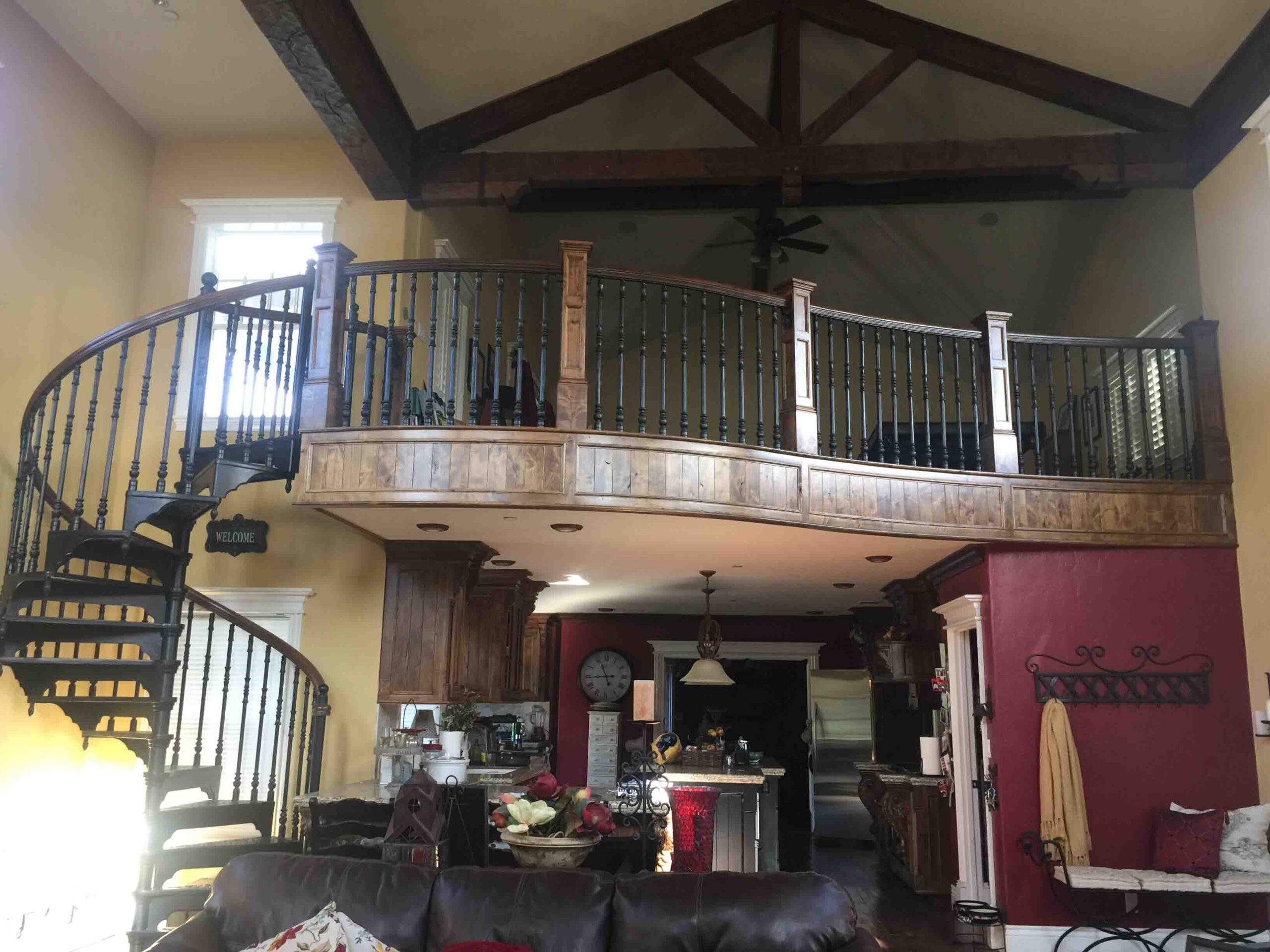 ‘The Family Room in our home is a two storey open beamed ceiling with a game room/pool table loft that is situated over the kitchen.  We did not have much space for stairs, so I had this idea to put up a spiral staircase.  I looked at a couple of options in the States but everything was modern and not the style we were looking for.