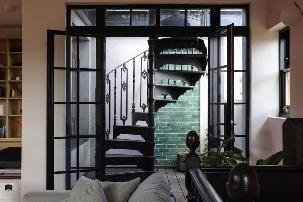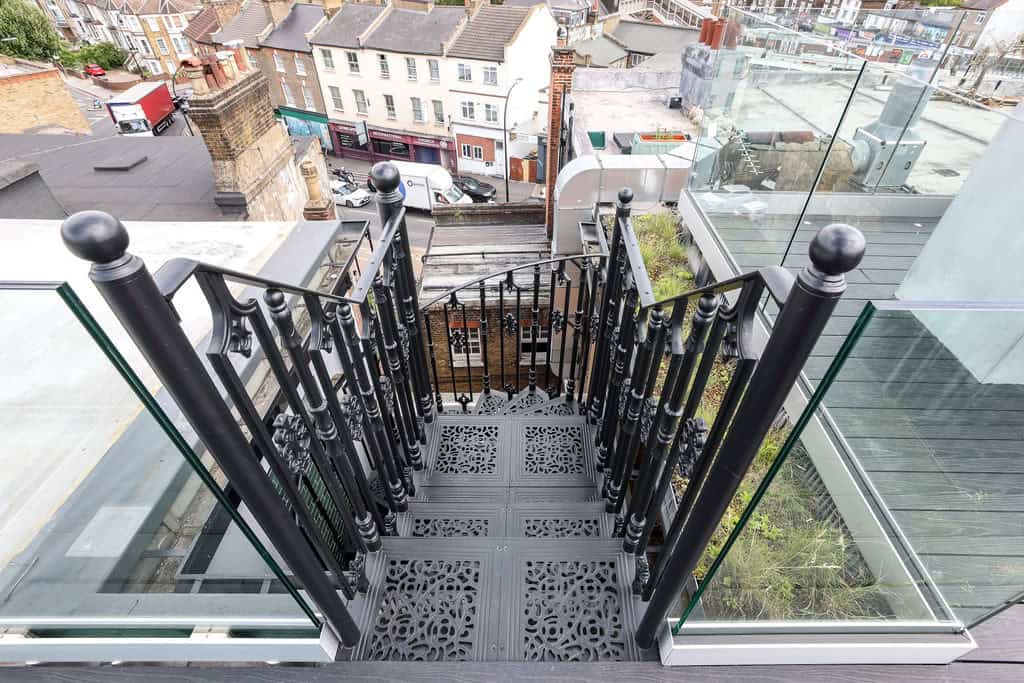 The Victorian-style staircase was paired with a sleek, modern glass railing, creating an interesting contrast. This combination fit perfectly with the home’s blend of industrial and Victorian elements, while offering contemporary elegance with the glass railing and roof terrace decking.